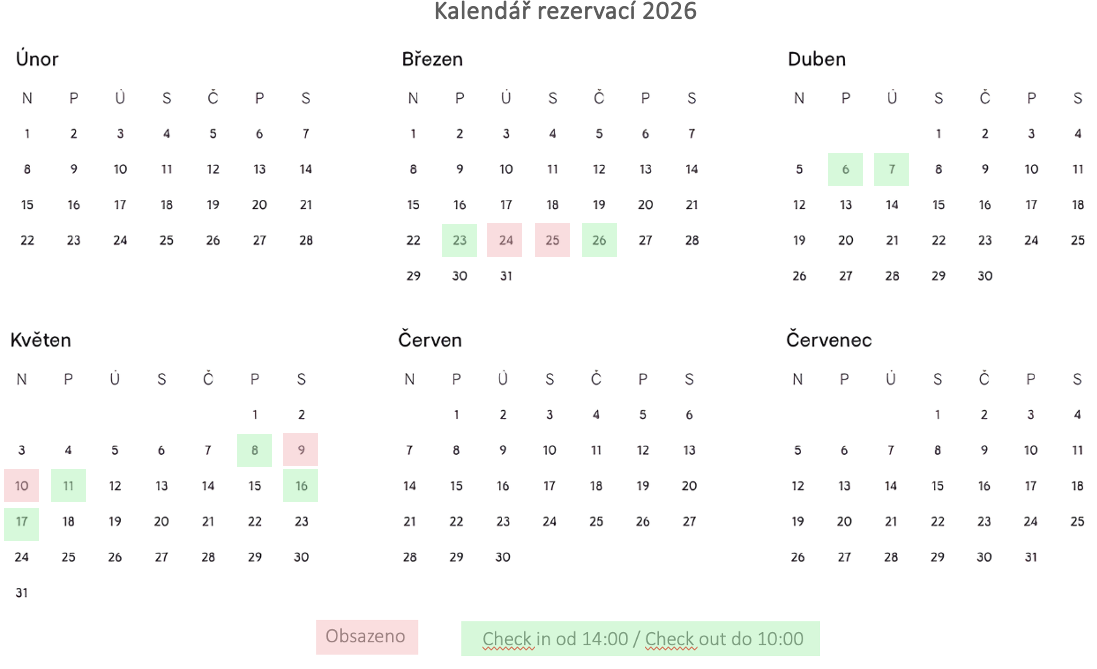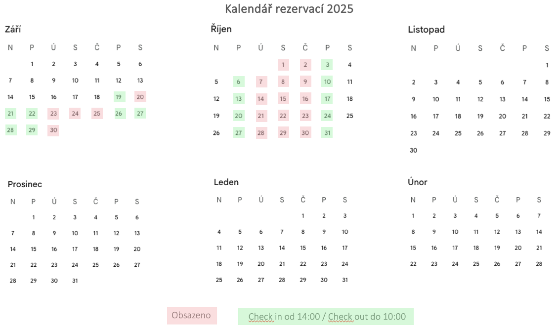 neoznačená místa v kalendáři jsou Vám plně k dispozici. V případě, že se rozhodnete odpočinout si u nás, se zvoleným termínem, či pro více informací nás prosím kontaktujte na: